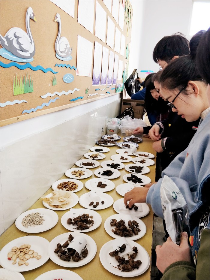 (同学们围在中药材旁边)