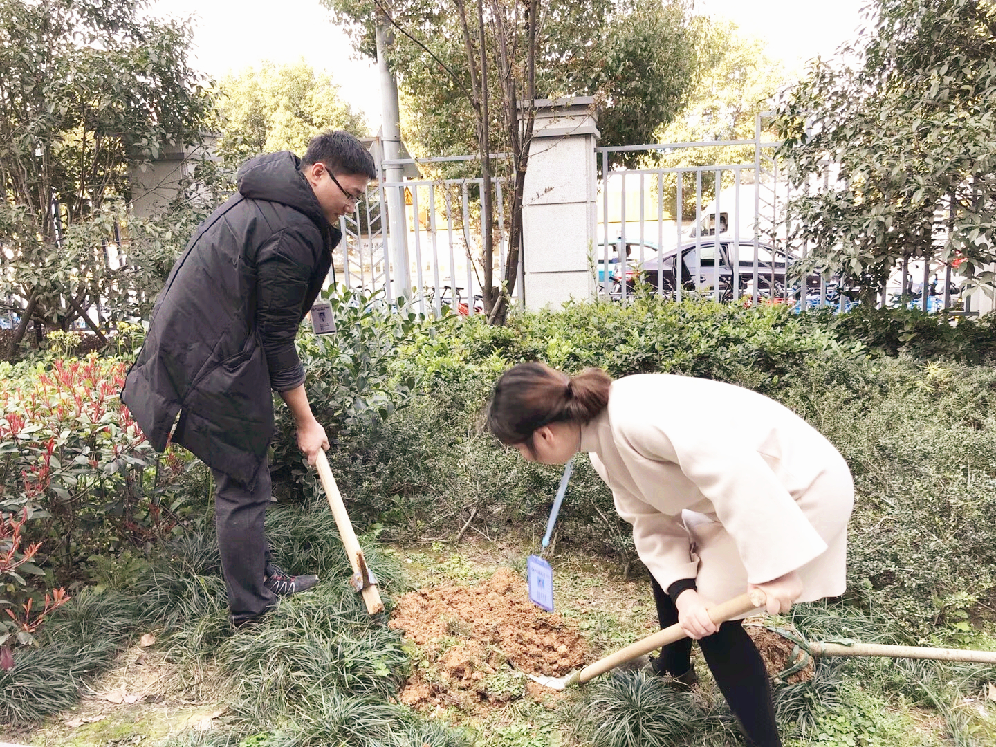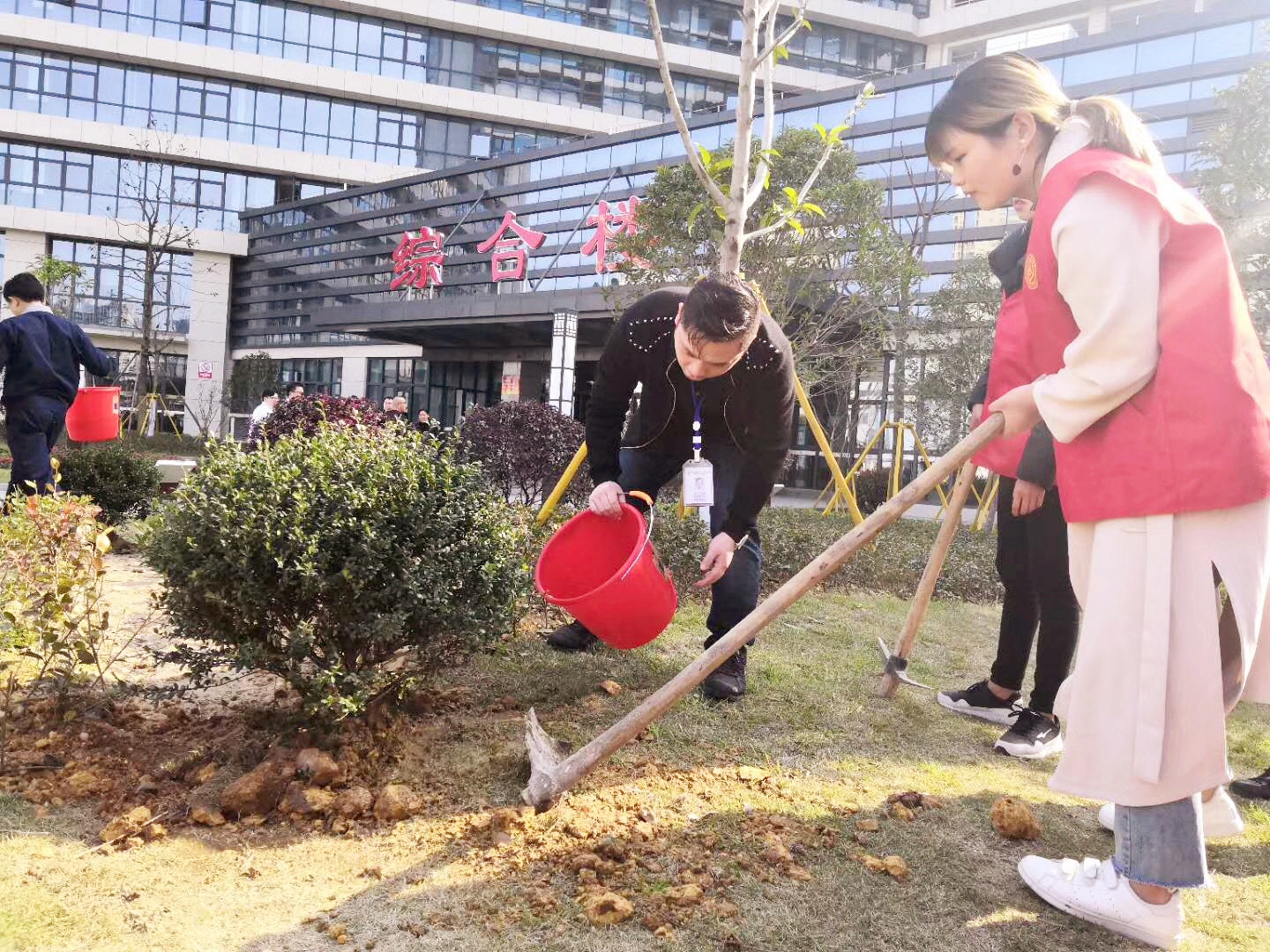 惠风和畅,春意正浓,正是植树的好时节。今年的3月12日为第40个植树节,当天下午,我院团委组织青年志愿者在六虹桥院区开展植树活动。植树现场,志愿者们以实际行动为院区增添新绿,从填土栽种到浇水护树,道道工序都一丝不苟,配合默契。劲往一处使、汗往一处流,充分发扬了团结、互助、友爱的精神。经过一个多小时的劳动,成功在院区栽种多棵树苗。