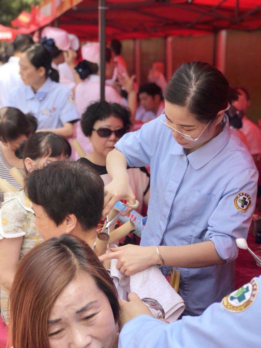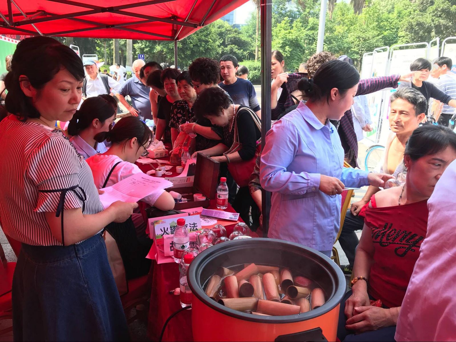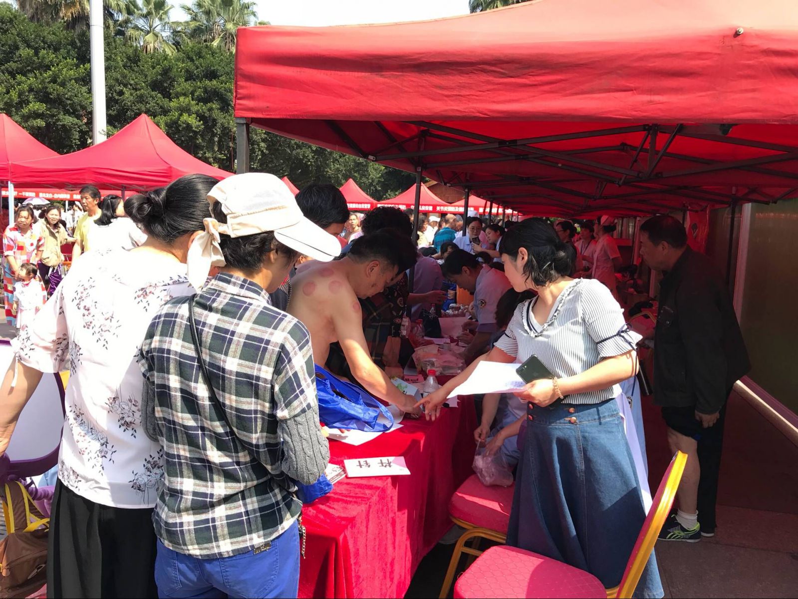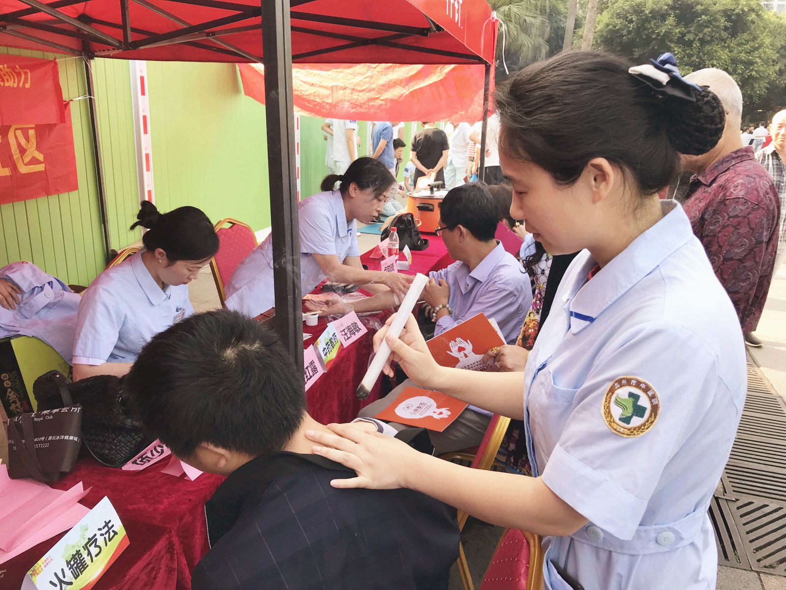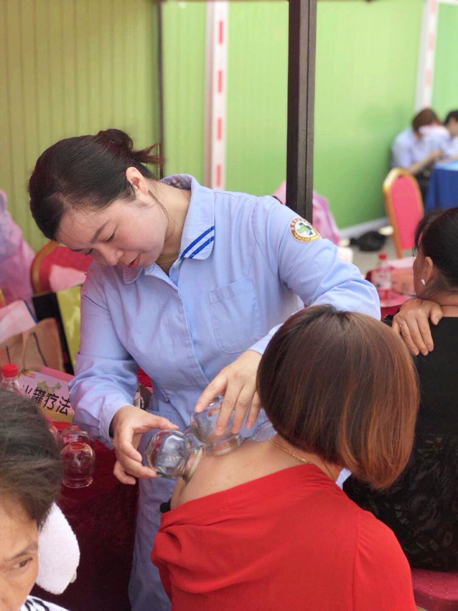 中药拔罐处也聚集了不少的群众,现代人基本上存在着颈椎和腰椎不好的毛病,中药拔罐是一种将中药和拔罐相结合的中药操作,将中药渗透到竹罐中,不仅起到拔罐的温热作用还起到中药的透皮吸收,从而达到疏通经络、祛除病邪的作用广泛用于颈椎病、肩周炎、腰肌劳损等疾病。