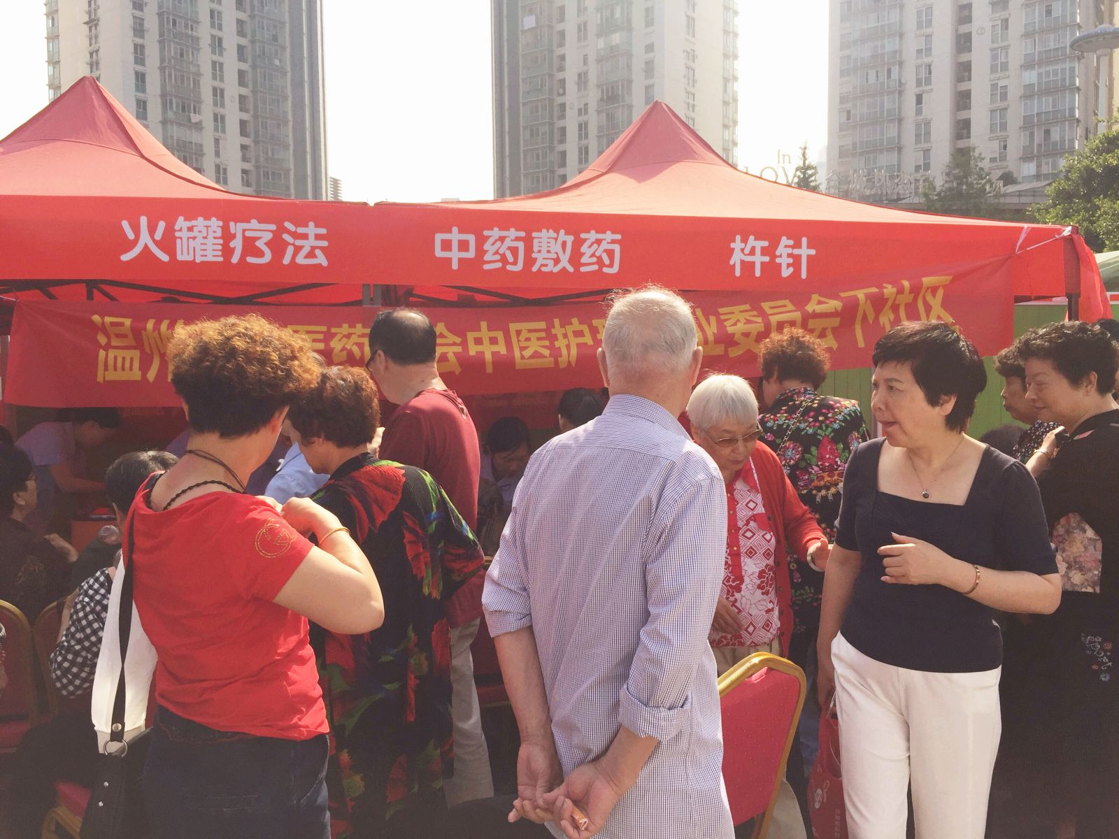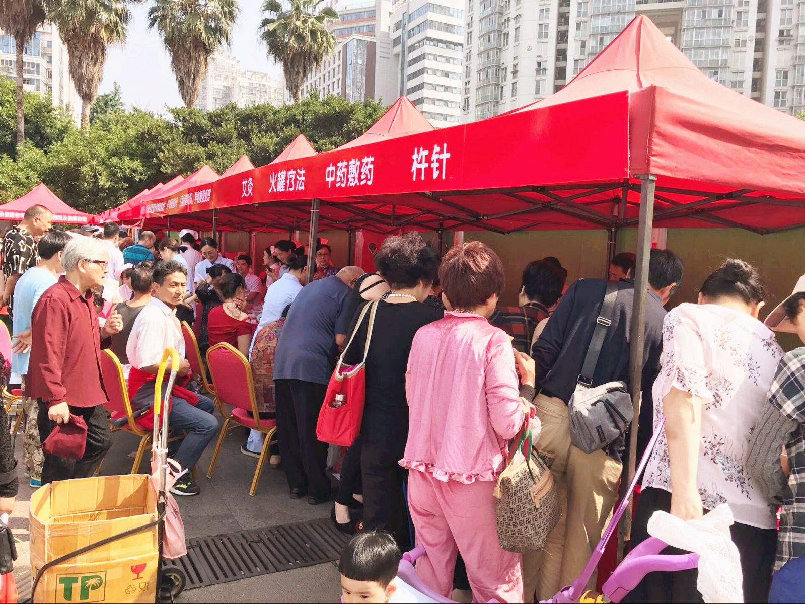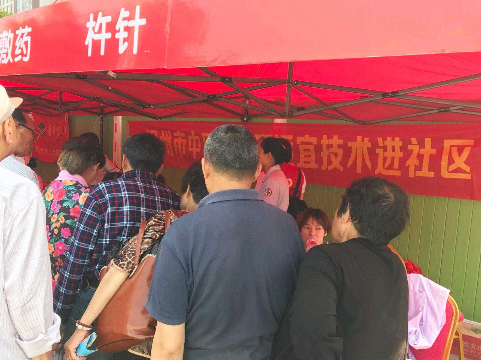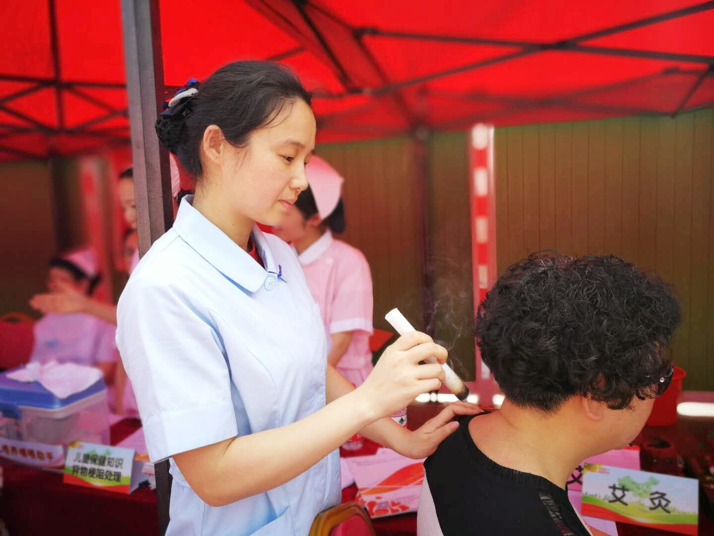 中药拔罐处也聚集了不少的群众,现代人基本上存在着颈椎和腰椎不好的毛病,中药拔罐是一种将中药和拔罐相结合的中药操作,将中药渗透到竹罐中,不仅起到拔罐的温热作用还起到中药的透皮吸收,从而达到疏通经络、祛除病邪的作用广泛用于颈椎病、肩周炎、腰肌劳损等疾病。