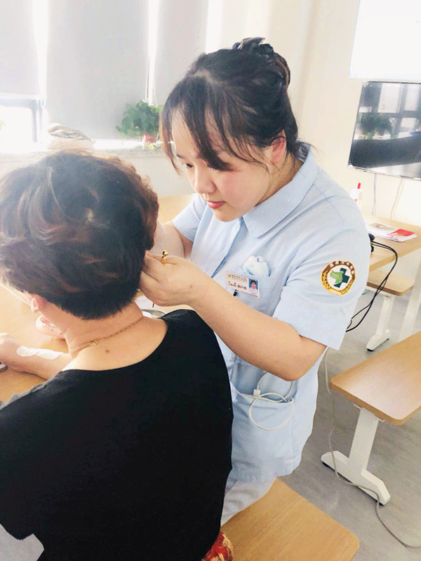 最后在叶艳护士和徐仲护士的带领下,患者和家属体验了耳穴埋豆和艾灸等中医操作。