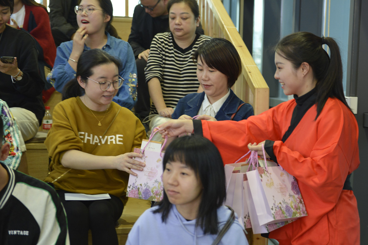 在最后的送吉祥环节,四名穿着国服的实习治疗师向每一位与会人员送上了特别的吉祥物——由温州市中医院特制的香囊、花茶以及药膳。