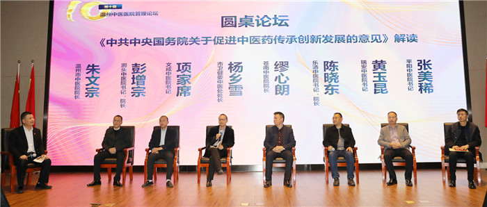论坛还安排了圆桌会议环节,针对《中共中央国务院关于促进中医药传承创新发展的意见》进行解读,温州市中医院朱文宗院长主持。杨乡雪处长、各县市区中医院书记、院长围绕主题,各亮“家底”,从不同层面、不同维度,做了全面深入的汇报与交流,探讨了新形势下中医药传承创新发展中的热点、难点话题。