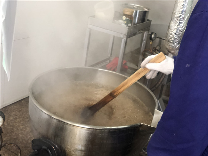 医生开出膏方后,首先由中药房配药,送往煎药中心煎药,值得注意的是,煎药前,普通饮片需浸泡 4—6 小时。煎完的中药经过筛网过滤,装在贴有患者姓名标签的红色桶中运送到膏方制作室。