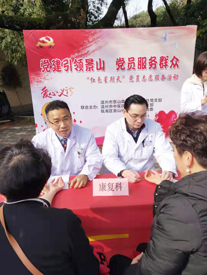 3月10日上午,我院水心景山党支部联合温州市景山森林公园管理处党支部、景山街道景山社区党委开展了以“党建引领景山,党员服务群众”为主题的党员义诊活动,用实际行动将健康送到百姓身边。