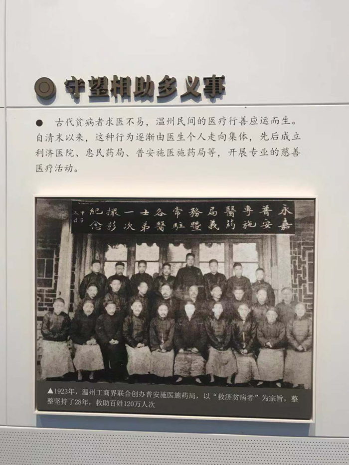 道德馆的刘讲解员详细介绍了在“守望相助多义事”事迹中关于在1923年由蔡冠夫等社会良人,因当时贫病者求医不易,特在温州工商界联合创办了普安施医施药局的故事,他们以“救济贫病者”为宗旨,整整坚持了28年,救助当时百姓120万人次。作为温州市中医院的前身,在场的党员们心中的荣誉感犹然而生,希望以后能踏着先辈们的足迹,发扬这种乐善好施的精神,继续为更多的患者治病行医。