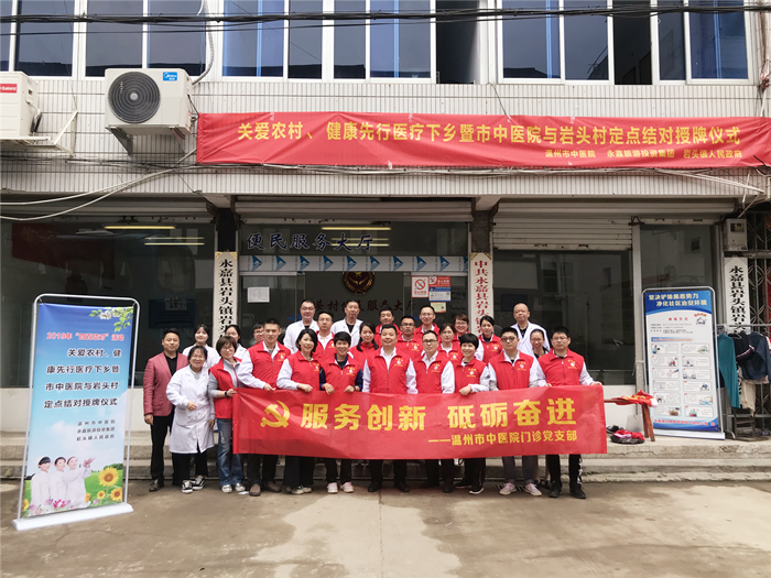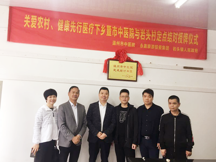 在我院院长朱文宗和门诊党支部书记戴清辉的带领下,我院与岩头镇人民政府和永嘉旅游投资集团完成了“关爱农村、健康先行医疗下乡暨市中医院与岩头村定点结对授牌仪式”,让永嘉人民不出门也能享受优质的医疗服务。