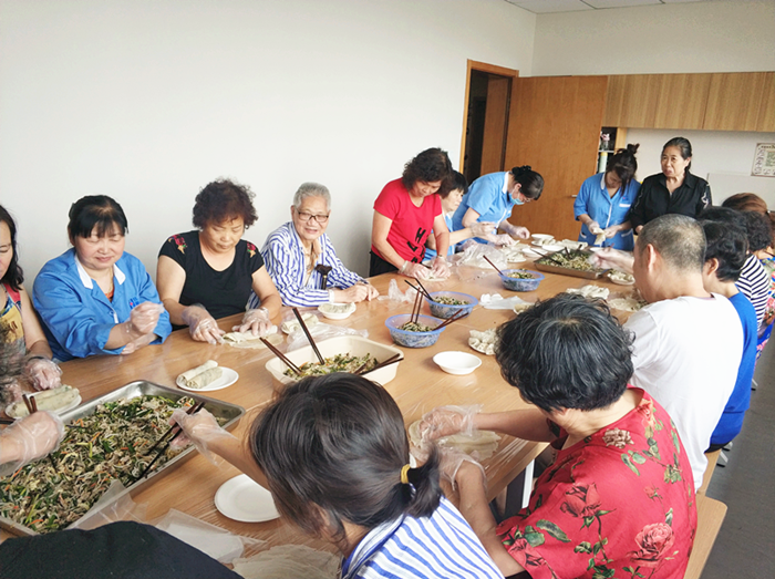 今日下午两点,综合内科2病区示教室内出现了热闹而又温馨的一幕:只见示教室内挤满了病人、病人家属及病区的医生和护士,大家其乐融融,用薄饼就着馅料包起了春卷。大家一起动手,不一会儿,就包好一大盘春卷。春卷饼薄料足,看起来相当美味,让人垂涎欲滴。包好后大家迫不及待地在欢声笑语中享用自己亲手制作的美食。在活动的最后,全体医护人员祝愿病区内患者早日康复。