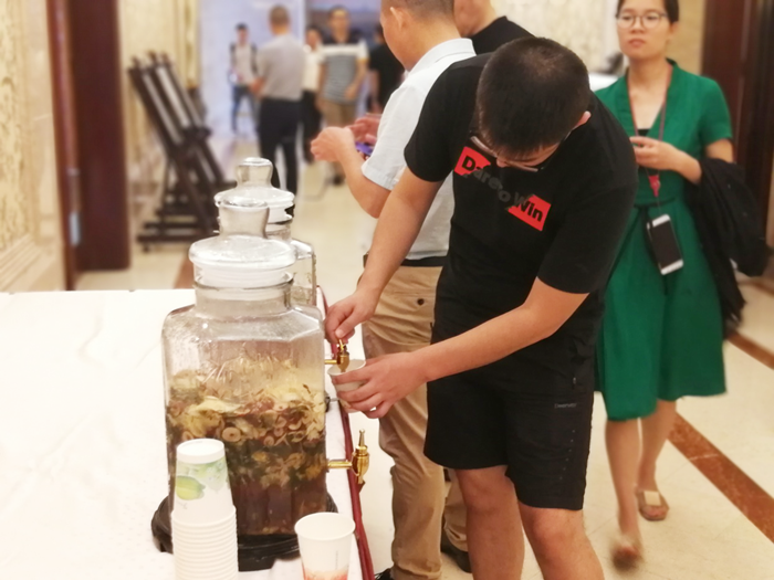 参会者在会务接待区品尝我院中药特色养生保健茶饮,感受中医药文化魅力。