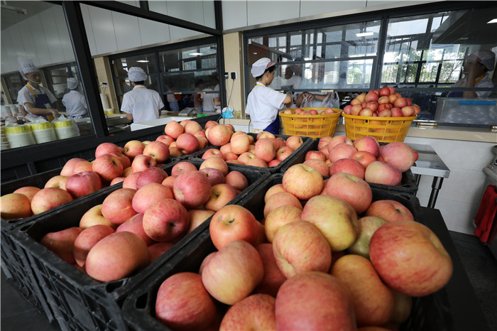 中午,一筐一筐的苹果也被早早的摆在职工食堂最里面的打饭窗口内,红彤彤的苹果,个头都不小,经过食堂员工认真的洗涤,显得格外漂亮诱人。
