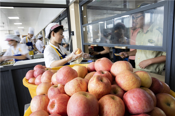 “给我来一个苹果!”、“科室同事还在忙,我给他们代领几个苹果”、“哇,今天的苹果真大!”午饭时间一到,窗口就排起了长长的队伍,职工们用饭卡刷一分钱,就可以领走一个苹果。
