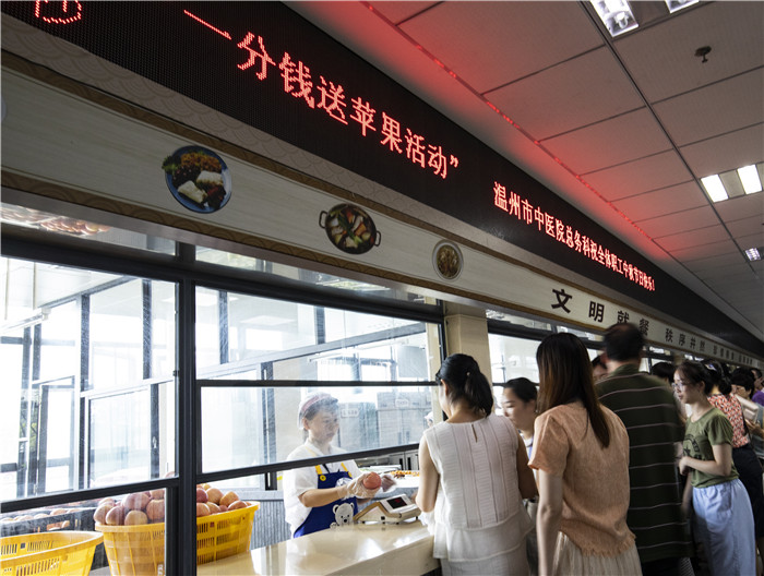 温州市中医院食堂负责人麻文士在旁边引导大家有序排队,他说,逢年过年食堂都会给职工送点小福利,工会给大家送月饼,那我们就送苹果,送平安。“虽然只是一个苹果,但相信大家也能感受到我们的祝福和心意。同时,我们也想通过‘苹’安食堂的中秋活动,对食堂的‘平安’安全生产进行宣教。”