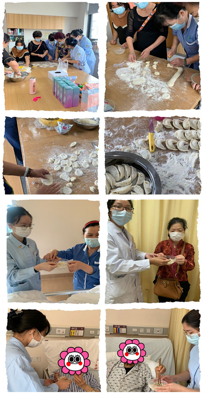9月28日,消化内科示教室里热闹非凡,原来是护士们准备了面粉、工具,还调好了猪肉馅和白菜馅的食材,想和患者一起热热闹闹过个节。参加活动的大多数患者和医务人员都是第一次亲手做饺子,他们跃跃欲试,擀皮、和馅、包饺子……陪护阿姨各个都是小能手,大家比赛谁的饺子包的最漂亮,活动现场欢声笑语,其乐融融。