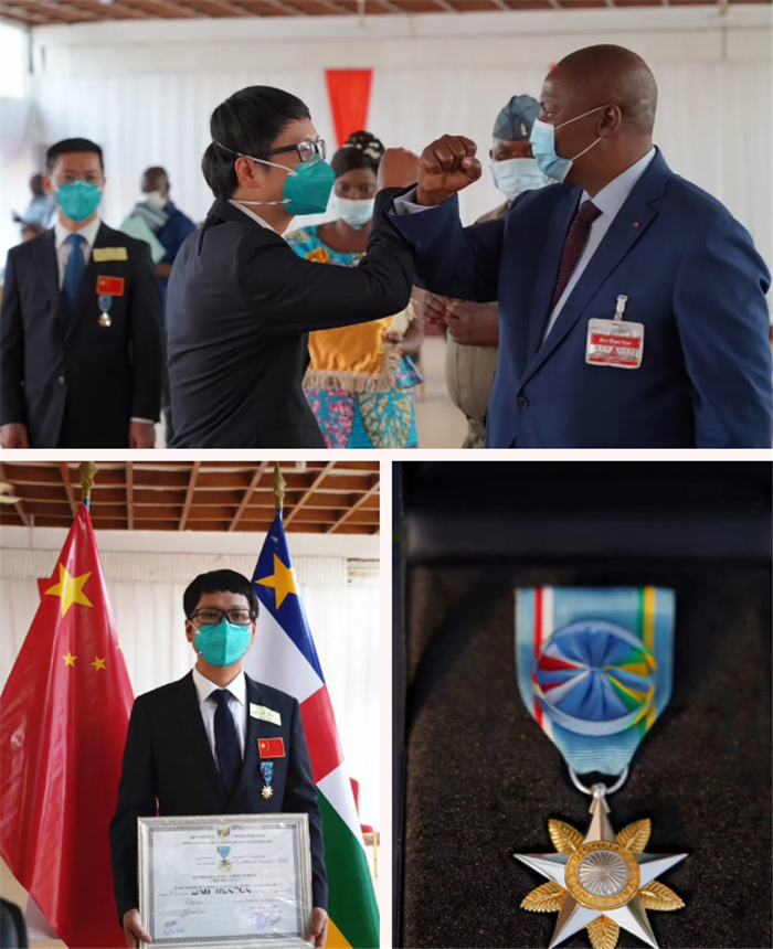 结束了18个月的援外医疗任务,包括温州市中医院医生廖文军和厨师王焕忠在内的第17批援中非医疗队日前已踏上回国路。离开中非前,当地时间12月26日,中非总统府举行为中国援中非第17批医疗队授勋和“中国-中非命运共同体中国大使奖章”颁发仪式,中非共和国总统图瓦德拉分别为廖文军和王焕忠戴上“军官勋章”和“骑士勋章”。