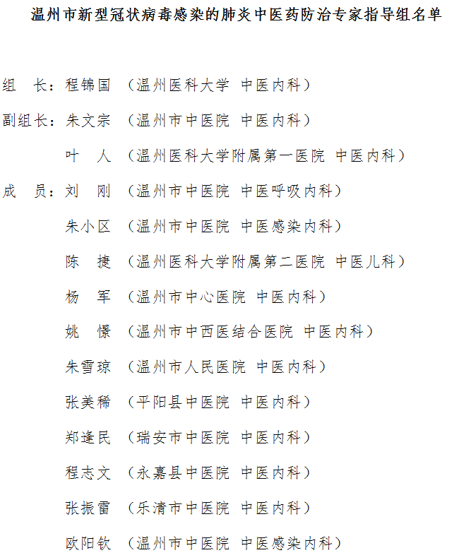 自新冠肺炎疫情暴发以来,温州市坚持中西医结合,充分发挥中医药防治疫病的优势。2月8日,由温州医科大学党委副书记程锦国教授担任组长,温州市中医院院长朱文宗、温州医科大学附属第一医院中医科主任叶人担任副组长的温州市新型冠状病毒感染的肺炎中医药防治专家指导组成立,14位中医内科权威专家组成温州中医内科的最硬核团队,全程参与全市新型冠状病毒感染肺炎的防治工作。