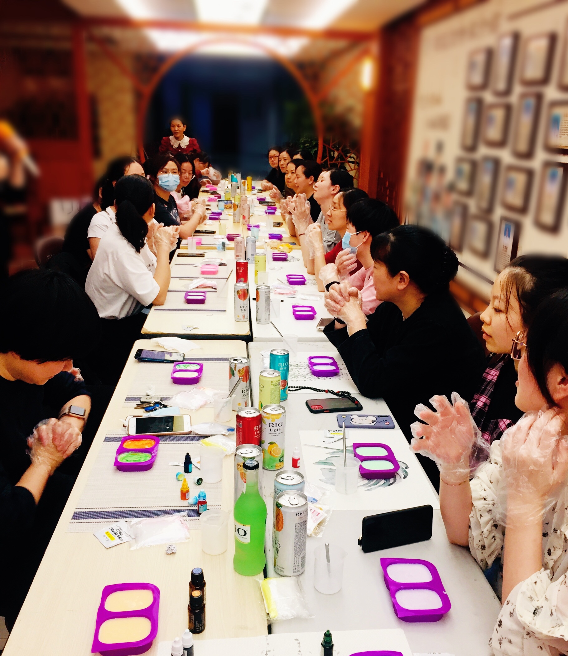活动正式开始,理疗师先为在场的护理人员介绍精油的功效,示范了如何使用精油,以及讲解了精油皂制作的流程,还设置了答对有奖环节,现场气氛非常活跃,细心的芳香理疗师帮大家把皂基切成块,加热,滴精油。