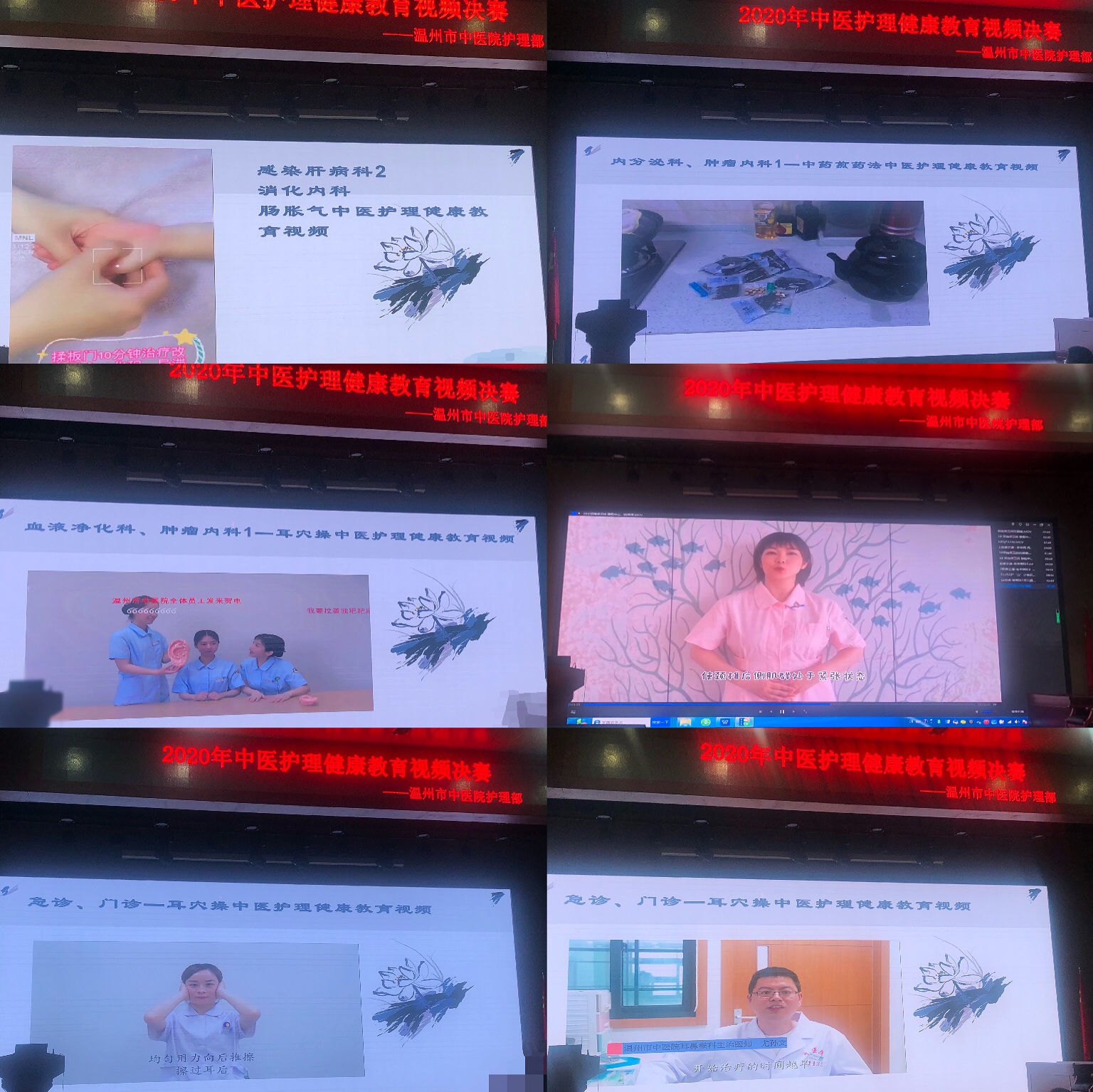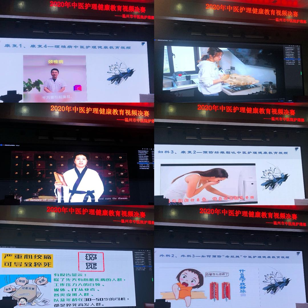 为庆祝“5.12”国际护士节,弘扬中医药知识文化,5月15日下午,由温州市中医院护理部、工会主办的中医护理健康教育视频决赛在综合楼八楼会议室举行,党委书记王庆来,院长朱文宗,副院长缪心军、麻瑞龙,纪委书记张伊凡及工会副主席夏平易,技能培训中心主任金瑞芬,预防保健科主任邹碧泉,护理部主任卢韵琦对比赛进行评分。