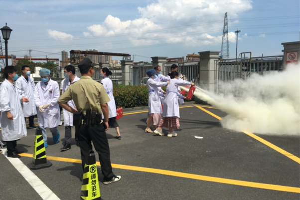 在随后的演练中,医护人员模拟危化品泄露,发生火情按下手警,微型消防站值班人员在接警后,立即利用对讲机发出指令,各演练组在听到指令后,迅速出动开展灭火:第一组灭火人员赶到后利用灭火器进行灭火,第二组人员穿戴完毕,迅速到位,利用消防水带将火扑灭,逃生和疏散同时开展工作,演习程序正规,秩序井然。整个演习从报警、接警、出动、疏散、灭火展开,层次分明有序,技能动作规范,灭火程序清楚,疏散快而有序。