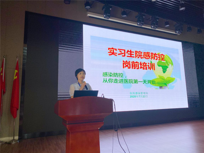 院感科徐玉燕科长主讲医院感控相关知识,从消毒、灭菌开始再到医院感染的案例延伸出护士如何做好医院感控,如何做好消毒、自我防护工作,特别强调疫情防控期间如何做好新冠肺炎防控,强调实习生们在实习过程中也应谨记提高自我防护意识,保障自身安全。