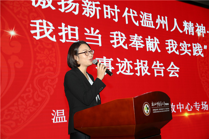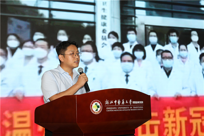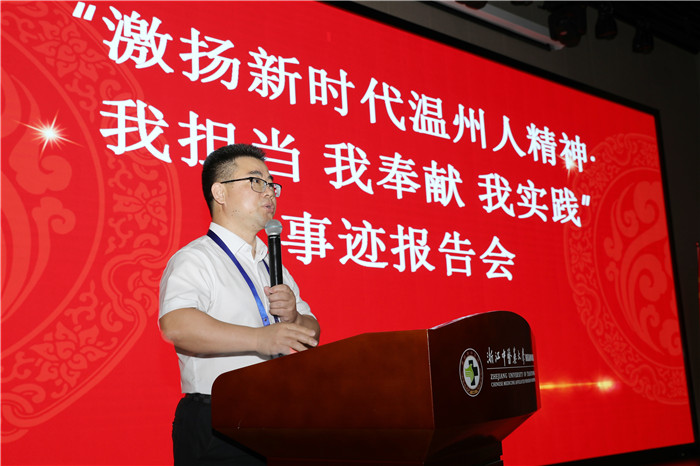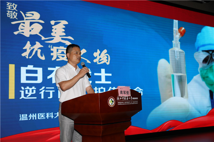 龚军俊委员在报告会上致辞。他表示,举办“激扬新时代温州人精神”事迹巡回演讲,回顾温州战疫的艰苦历程,是对医护人员逆向而行的深情礼赞,更是对新时代温州人精神的全面激扬。在这场大考中,温州市中医院充分发挥中医特色优势,为全市打赢新冠肺炎疫情阻击战作出了不可替代的贡献。他强调,市中医院全体干部职工要在对标对表中汲取强大精神力量,进一步弘扬抗疫精神,护佑人民健康,充分发挥中医药在预防重大传染病中的独特优势和作用,加快构建中医药特色的预防保健体系,促进中医药传承创新发展,为高标准推进健康温州建设、高水平打造区域医疗康养中心城市作出新的更大贡献。