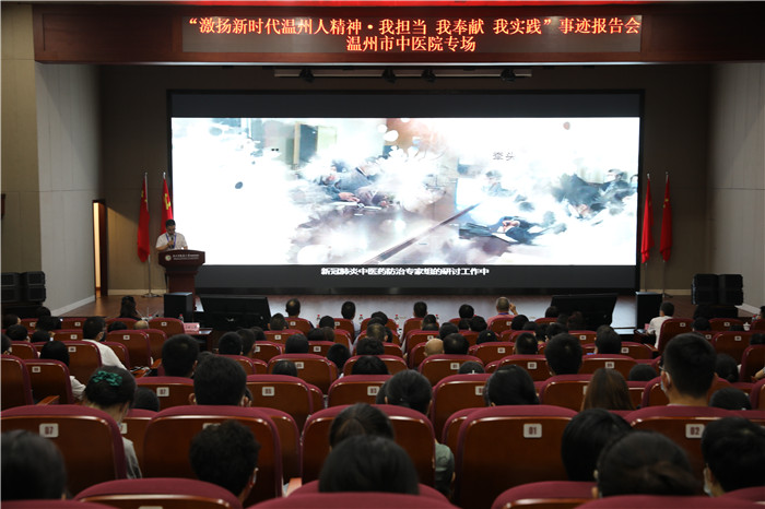 报告会由温州市中医院党委书记王庆来主持。王庆来表示,面对来势汹汹的新型冠状病毒,温州市中医院全力以赴落实疫情防控及医疗救治工作任务,第一时间组建疫情防控领导小组,迅速组织专家团队研发抗新冠肺炎预防方,3种中药制剂获浙江省药监局批准成为医院制剂,克服各种困难在互联网医院平台开设中医预防汤剂端口,疫情初期1-2月共在线接诊5000余次,接受免费在线发热咨询3000余次,为市民定制中药汤剂约2400单,还先后煎制了5万余包中药汤剂免费供应各组织。医院全体医护人员放弃休假,用白衣为战甲,筑起了坚固的生命城墙,诠释了“敬佑生命、救死扶伤、甘于奉献、大爱无疆”的职业精神、医者仁心及战胜疫情的决心、信心。