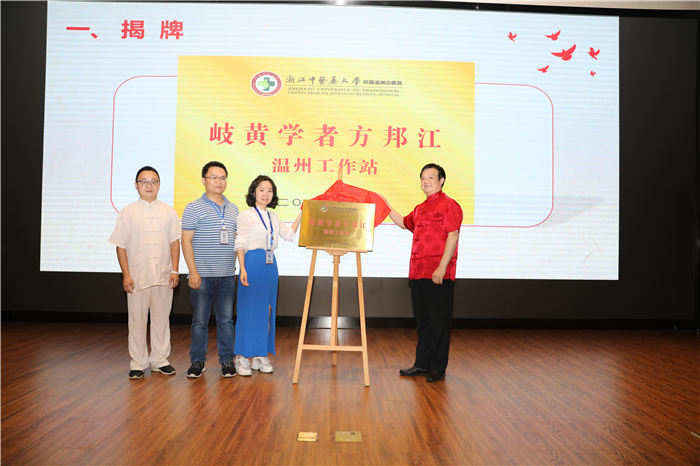 方邦江教授与温州市中医院党委委员、纪委书记张伊凡共同为岐黄学者方邦江温州工作站揭牌。