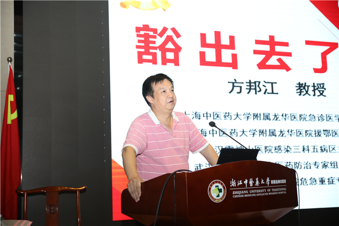 随后,方邦江教授还为温州市中医院的医护人员上了一堂主题为《豁出去了!》的疫情防控工作专题党课,温州市中医院党委成员、医院各支部党员共100余人参与党课,在亲历人的讲述下,共同回顾了中医药参与抗击新冠病毒肺炎疫情的工作,党课由温州市中医院党委委员、纪委书记张伊凡主持。