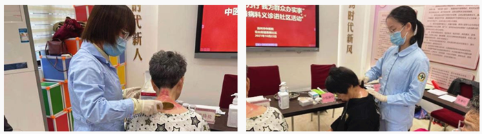 讲座结束后,由肾病科主任黄蔚霞主任带队,携同陈宇副主任医师、邵思思副主任中医师、陈春副主任医师、吴睿轩主治中医师、项方家中医师组成的义诊团队开始忙活起来了。科室护士长陈若如和林思思、邵叶红护士为颈肩部不适的老人做艾灸、刮痧、耳穴等保健操作,也安排了测血压、测血糖项目。