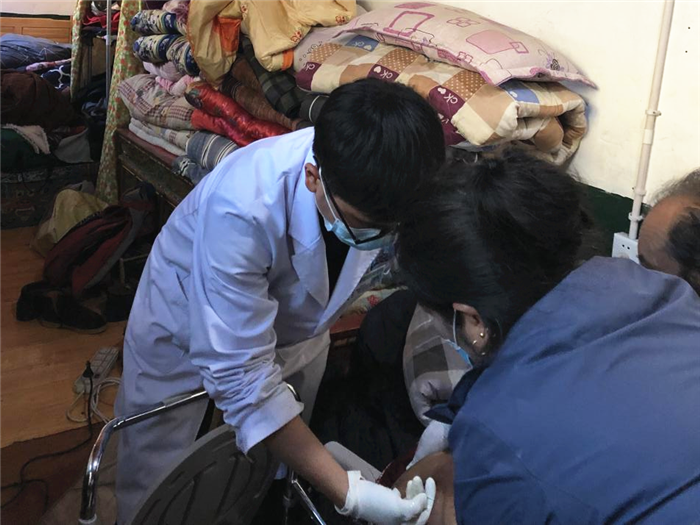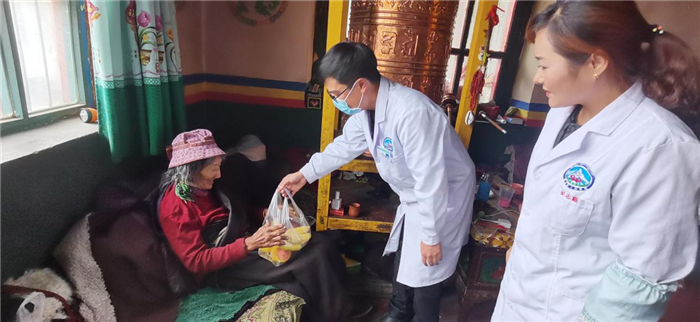 在嘉黎镇十四村,陈余圣耐心问诊,仔细查体,认真诊治,免费为村民发放相关药品,同时详细介绍了药品的服用方法和注意事项。嘉黎镇十四村居住着很多行动不便的老人,他不仅为他们送医送药上门,还特地自费为他们送上了水果等慰问品。