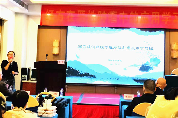 由于疫情原因,继教班以“线上+线下”的形式进行,特请来了经方大家、擅用经方治顽疾的黄煌教授,他通过视频,为大家带来一场十分精彩的“经方”课。黄煌教授根据多年的临床经验总结出多张肿瘤常用经方,如治疗肠癌便血的 “黄芩汤”、治疗血液系统恶性肿瘤的“柴苓汤”、治疗肿瘤恶病质的“薯蓣丸”以及治疗恶性肿瘤所致肠梗阻的“温脾汤”。“有是证用是方”,“留人治癌”是黄煌教授治疗晚期肿瘤的重要理念,他强调不把肿瘤攻击放在第一位,而是针对患者整体状况进行调理,维持患者生命,使患者“胃口不倒、体重不减、精神不垮”,达到人癌共存的状态。黄煌教授讲课生动形象,引经据典,亦结合现代医学研究,用一个个医案与大家分享了他对经方治疗肿瘤独到见解,赢得了现场学员的掌声。