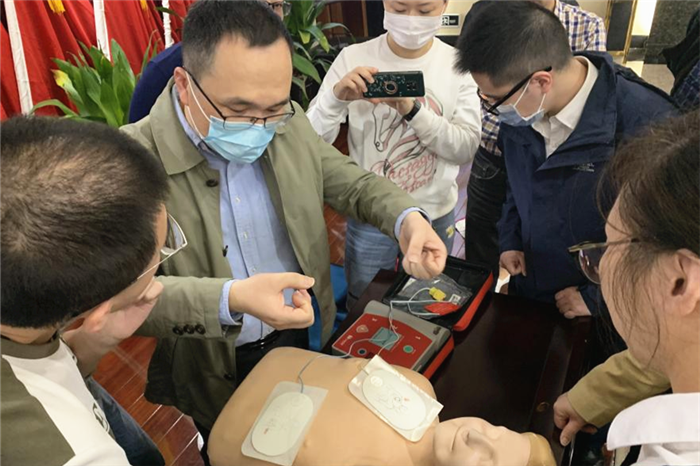 在随后的现场演练中,林德照医生与虞琼傲护士合作,分组用专业人体模型同步演示心肺复苏的标准流程、海姆立克急救法以及AED的使用,手把手示范,点对点操作,教授交行工作人员急救技能。理论实践相结合,生动直观,易于掌握,受到了在场工作人员欢迎,纷纷上场体验。