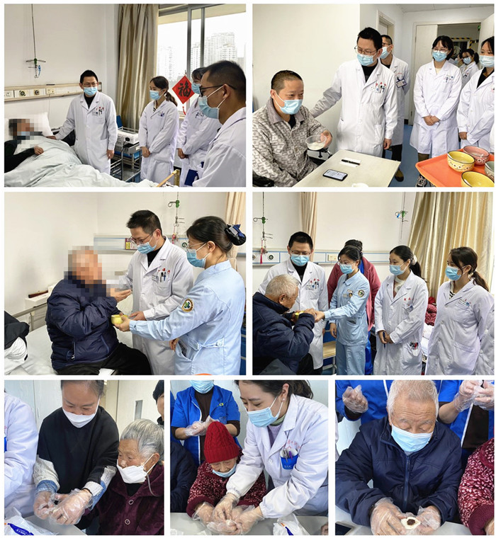 在水心院区康复科5病区,吴登宠副主任医师携康复5科全体医护人员给病房患者及家属送汤圆送祝福。鼓励患者参与汤圆的制作,这不仅是节日慰问也是手功能训练,将康复训练融于生活,寓教于乐。病房因此增添了浓浓的节日氛围,很多家属还纷纷跟子女视频,在线分享节日的喜悦。