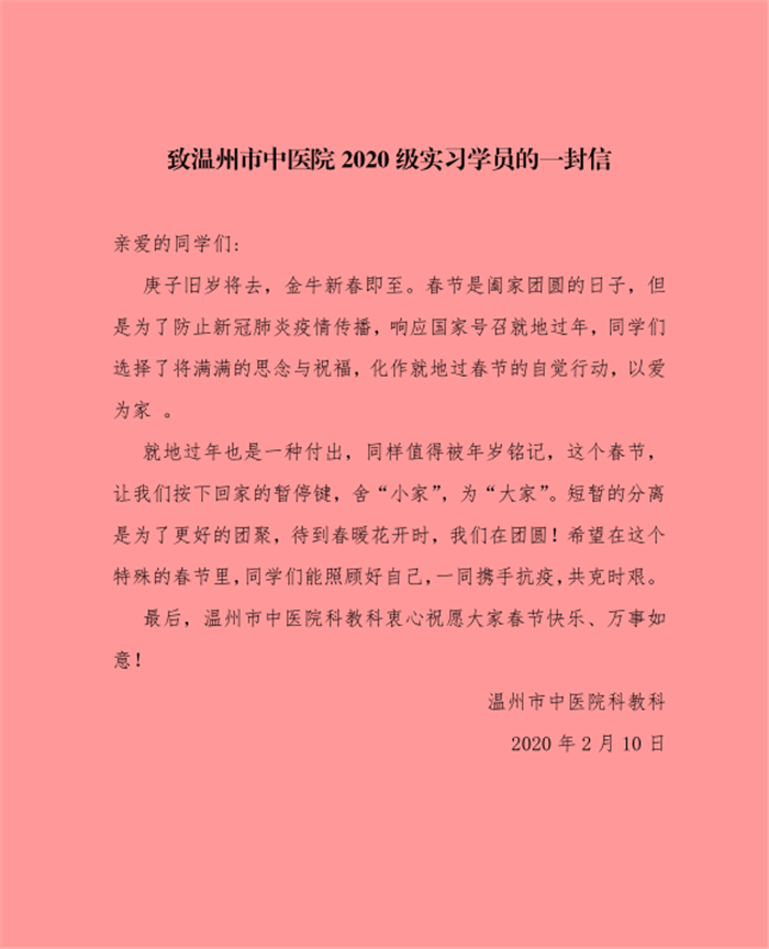 温州市中医院的这四十四名来自不同省份的实习和进修学员在这个特殊时期,选择对家庭做出最大的守候——原地过年,这不仅是为降低全国医护人员的工作负担贡献了一份力量,更是为降低医护人员的感染风险奉献一份爱心。