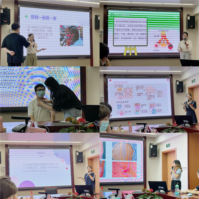 此次大赛分为初赛和决赛两个阶段。8月25日,实习生小组分别组织开展实习生讲课预赛,51名实习生分别归至内科片1、内科片2康复科片、外科片妇科片、特殊科片四个科片,各科片护生认真准备课件,讲述了各个科室不同专科性的健康宣教内容。在激烈的初赛评比之后,各科片从51名实习生中选出12名优胜者进入总决赛。