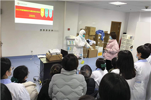 黄笑夏主任对去年的疫情进行回顾,对当下的疫情情况进行汇报,带大家认识奥密克戎病毒,并列举了几起医院感染事件,同大家一起分析探讨,还特邀静配中心金菲菲护士长、姜圆圆主管护师培训如何正确穿脱防护服、示范七步洗手法。