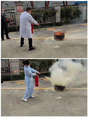 随后,在郑国胜及保卫科何盛金的指导下,内分泌科职工进行干粉灭火器的实操训练。