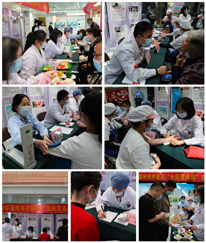 今年5月15日—5月21日是第八届全民营养周,为了更好践行全民营养的理念,落实好全民健康的需求,温州市中医院在六虹桥、景山、水心院区分别开展了全民营养周活动,通过线上宣传、线下义诊宣教答题等多形式同步开展相关营养周活动与营养知识宣传。