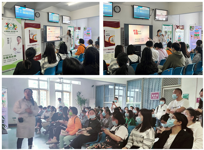 5月19日上午10:00—11:00,在水心院区门诊三楼,陈爱娇副主任营养师进行了健康宣讲《孕妇这么吃,长胎不长肉》,现场来了很多准爸爸,准妈妈听众,各医护人员和群众纷纷参与其中,学习营养相关知识。