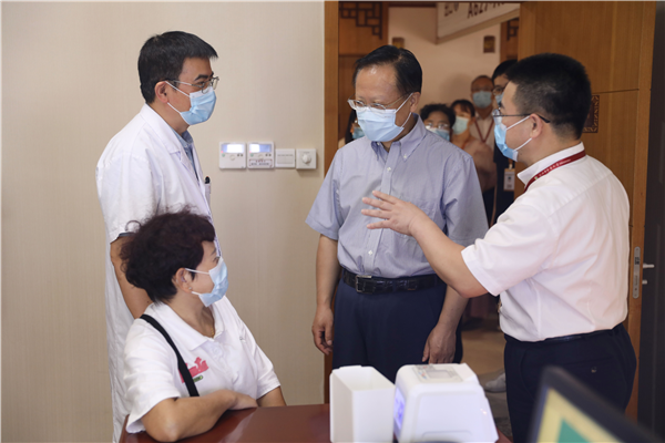 秦怀金一行实地察看了名医馆、普安养生保健学校直播间、针灸推拿科门诊、日间诊疗中心、中药房及党建书苑等地,听取了王庆来书记等人关于医院百年发展历史、重点专科建设和中医药特色发展情况介绍。